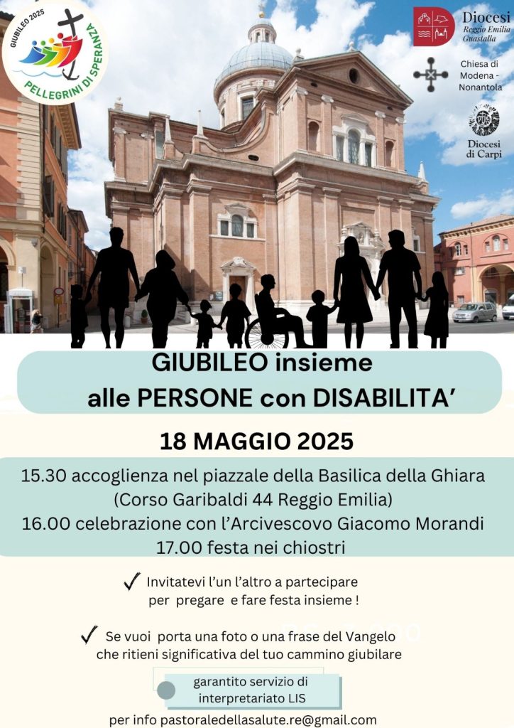 Domenica 18 maggio, alle ore 16, nella Basilica della Beata Vergine Maria della Ghiara a Reggio Emilia (in corso Garibaldi 44 a Reggio Emilia) è in programma il Giubileo interdiocesano insieme alle persone con disabilità organizzato da Diocesi di Reggio Emilia – Guastalla, Arcidiocesi di Modena – Nonantola e Diocesi di Carpi. Sarà presente l’Arcivescovo Giacomo Morandi.